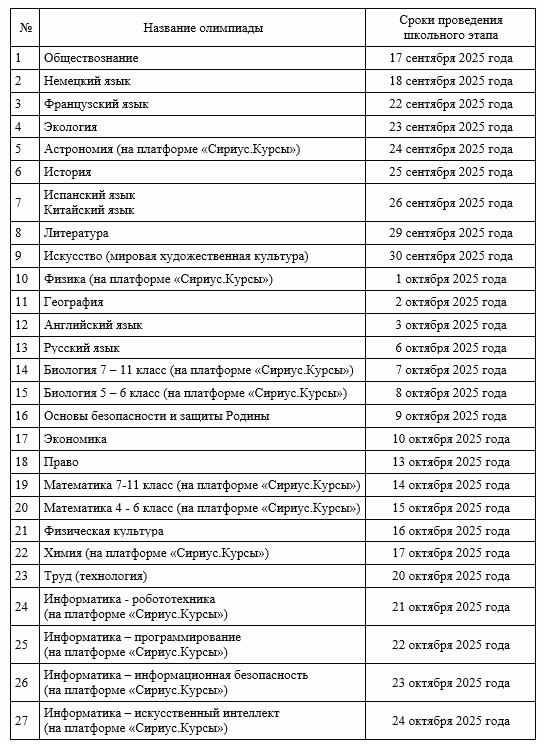 График проведения в Ленинградской области школьного этапа всероссийской олимпиады школьников в 2025/2026 учебном году