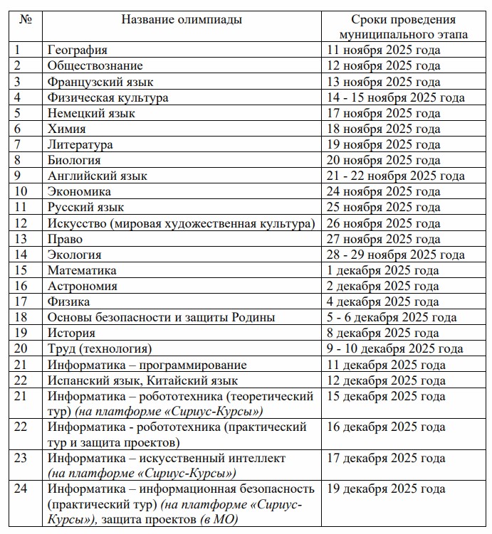 График проведения в Ленинградской области муниципального этапа всероссийской олимпиады школьников в 2025/2026 учебном году