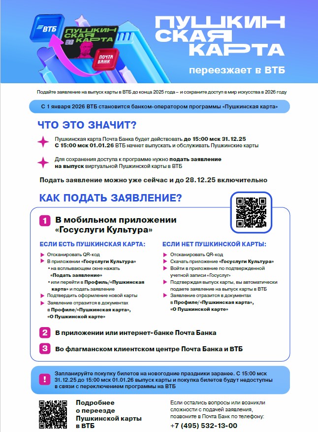 С 1 января 2026г. изменится банк-оператор программы «Пушкинская карта». В связи с этим необходимо до 28.12.2025г. подать заявление на перевыпуск карты Программы. Более подробно в приложенных файлах ✔https://disk.yandex.ru/d/nXOENt83onTIKg/Пушкинская%20карта.mp4 | |